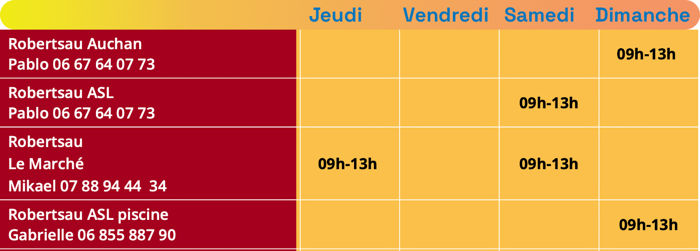 - Robertsau ASL : les samedis de 09h-13h – pour les réservations contactez Pablo au 06 67 64 07 73
