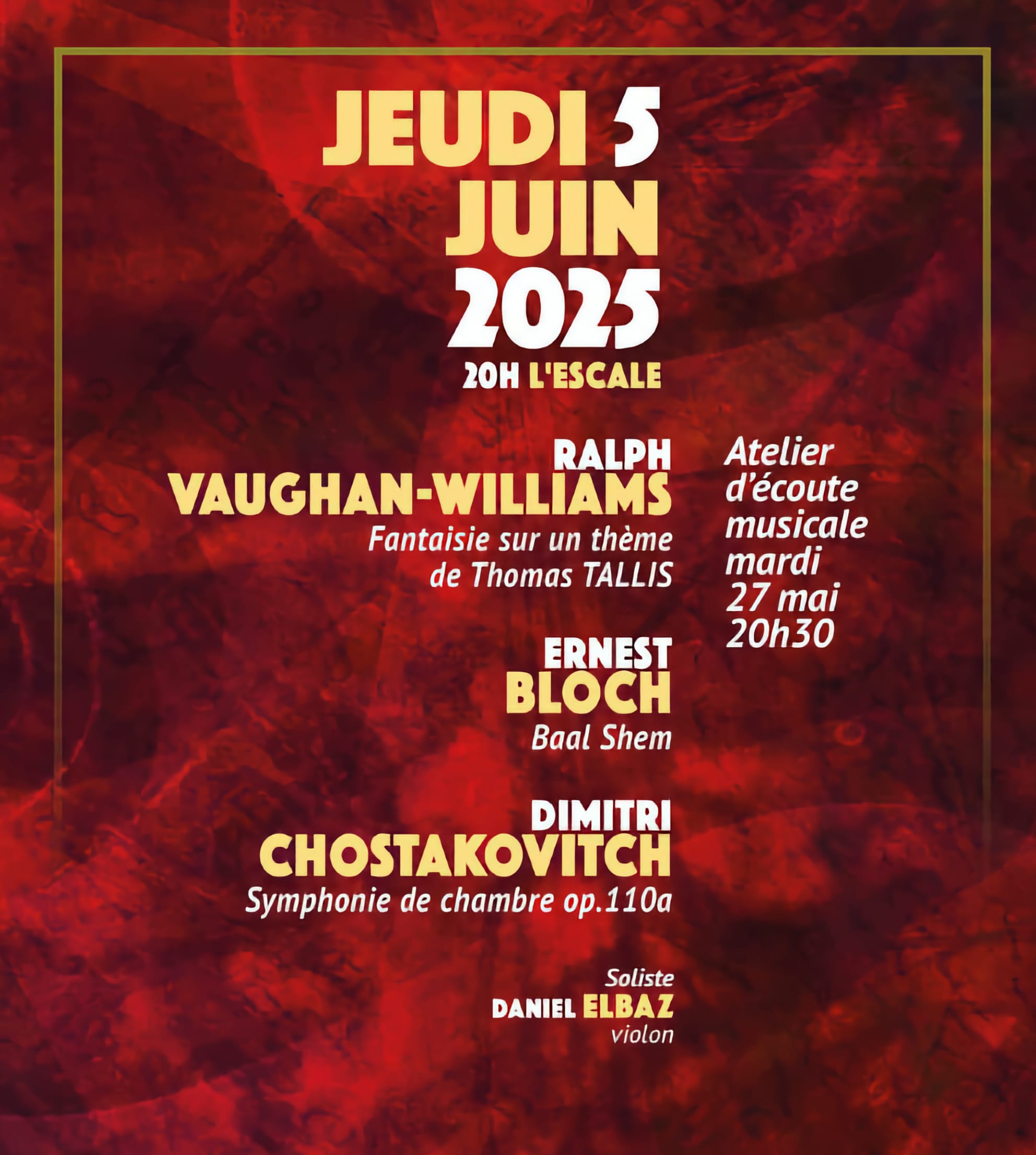 Le dernier concert fera la part belle aux cordes de l’Ensemble Volutes avec la Fantaisie sur un thème de Tallis pour double orchestre à cordes et quatuor soliste de Ralph Vaughan Williams, le 8e quatuor de Dimitri Chostakovitch dans une orchestration élargie à l’ensemble des cordes et une évocation de la musique juive d’Ernest Bloch, grand musicien indépendant d’origine suisse, méconnu, vivant son identité juive en marge des grands courants musicaux du XXe siècle. La partition est écrite pour violon et piano; elle sera également orchestrée pour la circonstance. Comme les autres années, les quatre ateliers d’écoute musicale organisés conjointement par Volutes et l’Escale vous seron proposés en amont des concerts. Les œuvres programmées pendant la saison y seront commentées, replacées dans leur contexte historique et émaillées d’exemples sonores. L’entrée est libre et je ne saurai que vous inciter d’y participer.