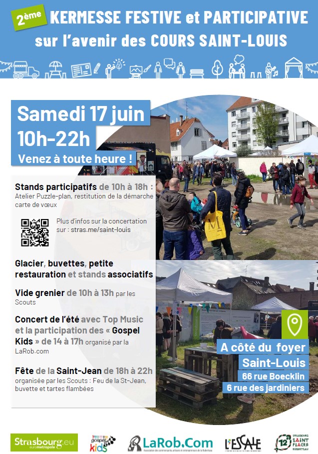 Samedi 17 juin 2023 de 10h à 22h vous êtes invité à la Kermesse participative et festive n°2, à côté du foyer Saint-Louis (66 rue Boecklin) 6 rue des jardiniers. avec au programme :