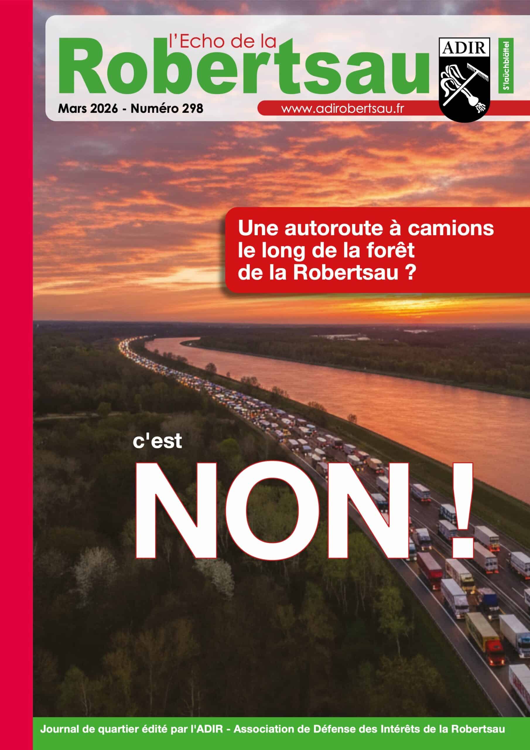 Mais là, où l’on voit rouge c’est que Catherine Trautmann n’a toujours pas renoncé à son projet d’autoroute à camions entre la forêt de la Robertsau et le Rhin. C’est le dossier en Une de l’Echo de la Robertsau. Déjà en 2020, elle déclarait :