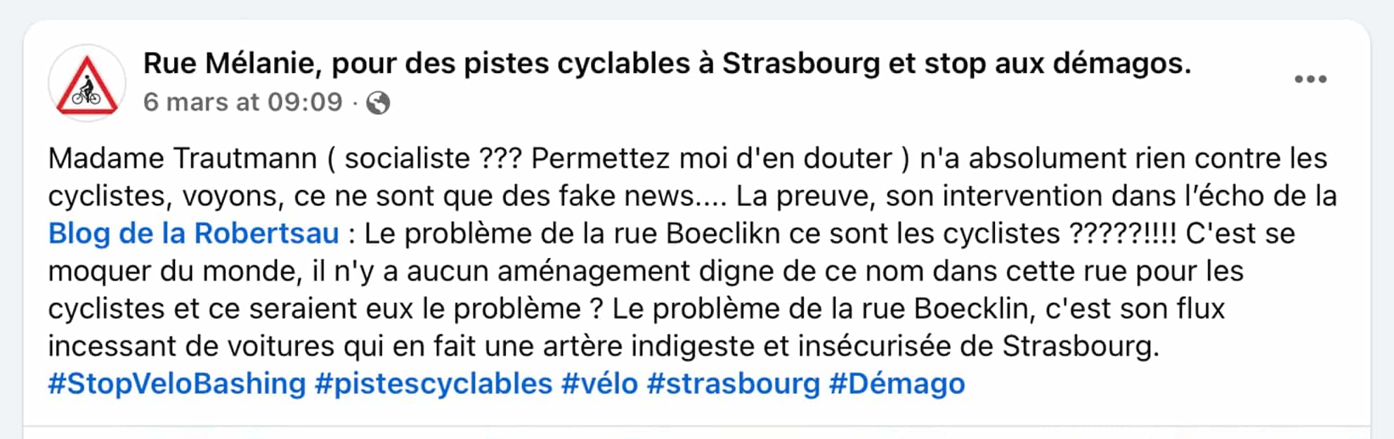 Comme l’a bien repéré la page Facebook Rue Mélanie, pour des pistes cyclables à Strasbourg et stop aux démagos, le problème de la rue Boecklin c’est bien la question de l’hégémonie des voitures et des bus, pas de transport doux, comme le prouvent les demandes citoyennes d’apaisement à 30 km/h au minimum.