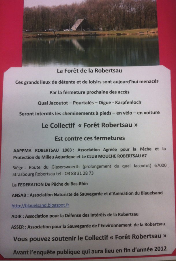 Un collectif nommé « Forêt Robertsau » commence à se mobiliser contre la fermeture annoncée du quai Jacoutot et de la digue derrière le Pourtalès. On y trouve AAPPMA, la fédération de pêche du Bas-Rhin, ANSAB, l’ADIR et l’ASSER.